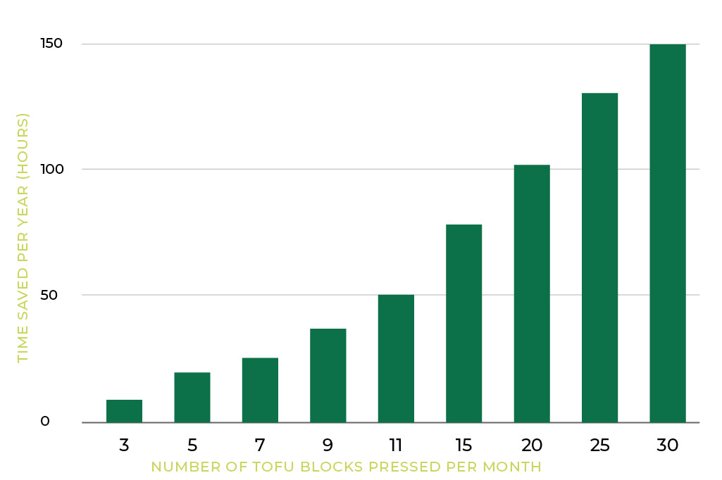 The chart below maps out exactly how many hours of food prepping time a year you can save. If you press 5 blocks of tofu a month, that’s 25 hours in food prep time saved!